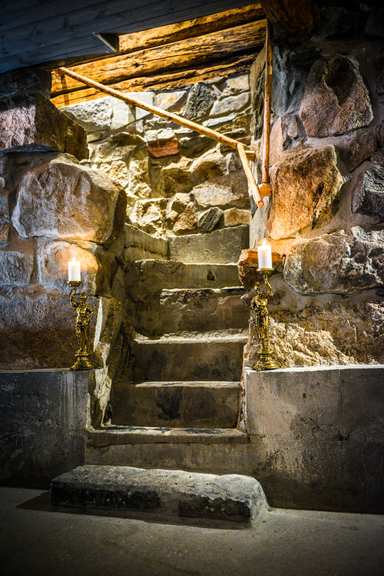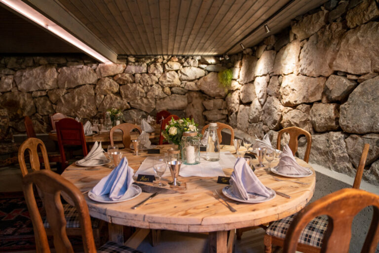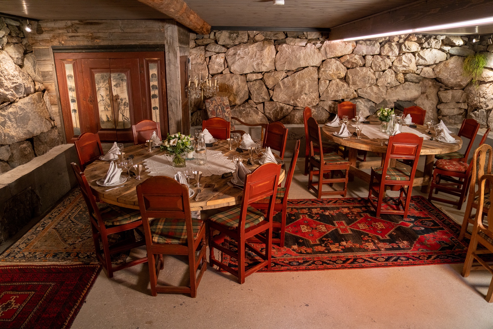 Vinrommet, som ligger i den historiske kjelleren på Hesla Farm, er et intimt og stemningsfullt rom som egner seg perfekt for møter, private vinsmakinger og kunstutstillinger.