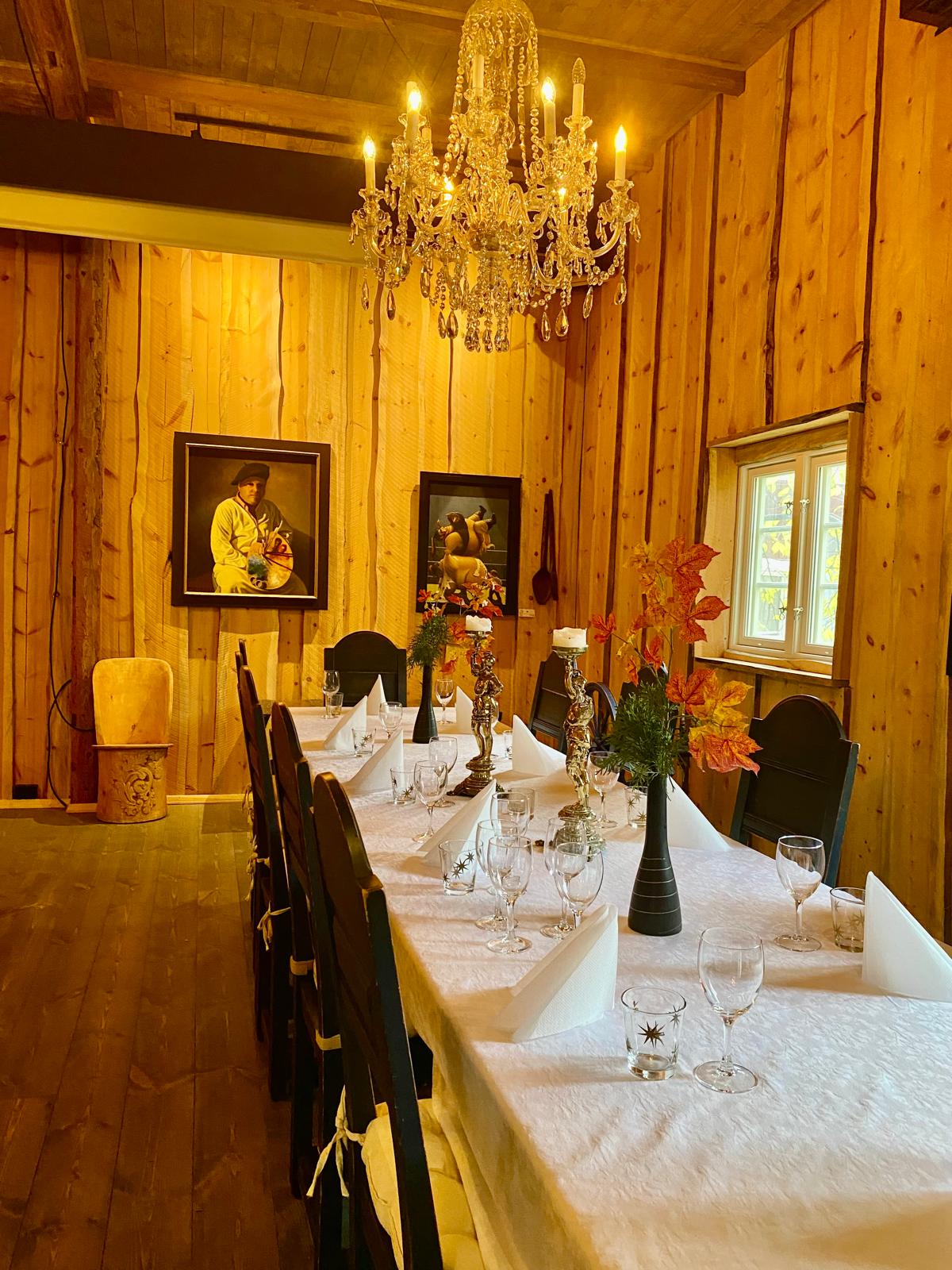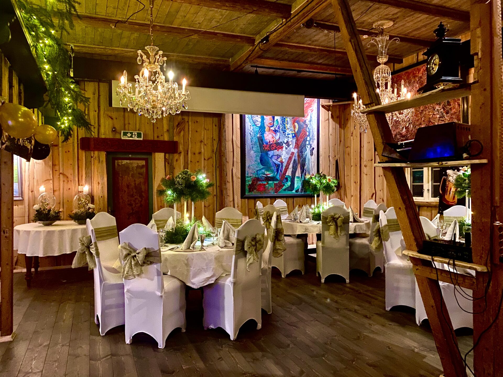 Lokalet utmerker seg med sine imponerende krystallkroner som tilfører et sofistikert preg, samtidig som de harmonerer med de originale trekonstruksjonene og andre autentiske detaljer fra det gamle fjøset.