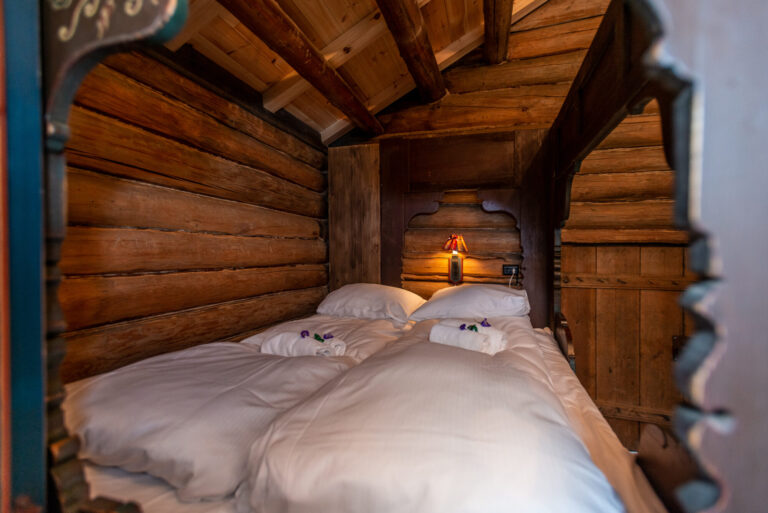 Gjestene kan sove i en original, rosemalt himmelseng fra 1600-tallet, omgitt av en verden av håndlaget interiør. Samtidig får man glede av moderne fasiliteter som et bad med steinvask, et kjøkken med kokeplate, TV og en balkong med utsikt over gårdsplassen. Dette gjør Asle til et ideelt valg for en romantisk ferie eller for reisende som søker en autentisk opplevelse.
